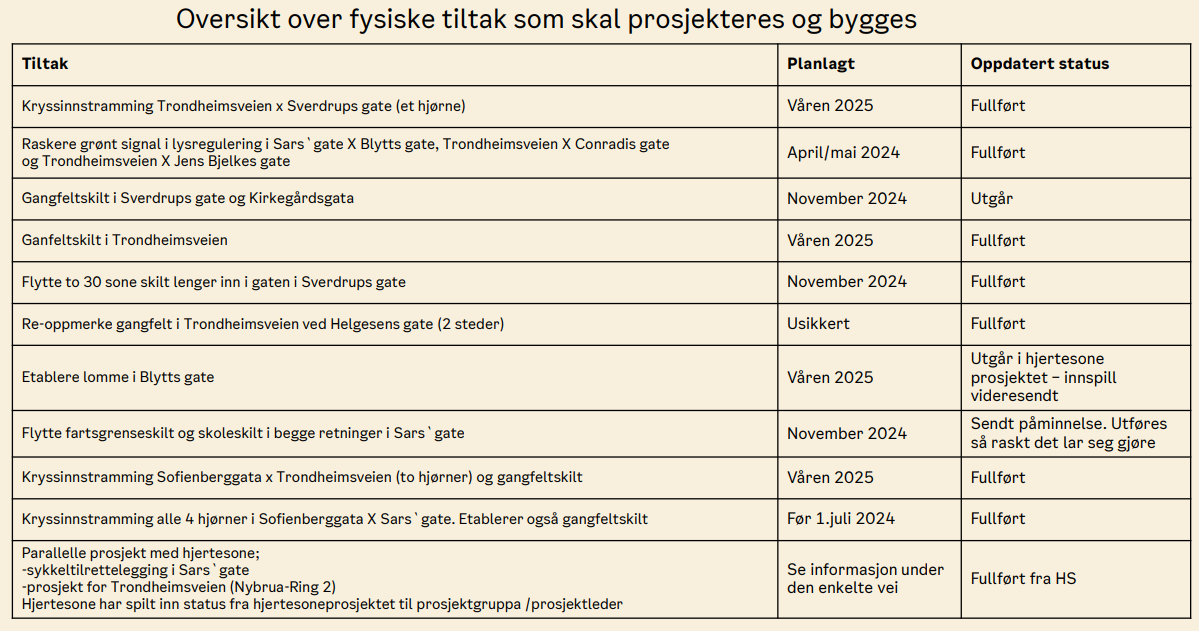 I Oslo skjer dette i samarbeid med blant annet Bymiljøetaten, Utdanningsetaten og Oslobygg. Skolen og FAU samarbeider tett om tiltakene, og elevene har selv fått mulighet til å uttale seg om hvilke punkter på skoleveien som oppleves som utrygge.